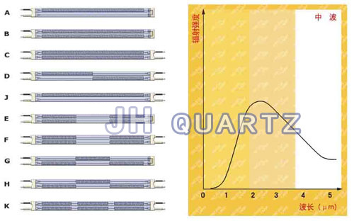 中波石英燈采用鐵鉻鋁電阻絲做發(fā)熱體,波長(zhǎng)在 2.2-3.5 微米之間。